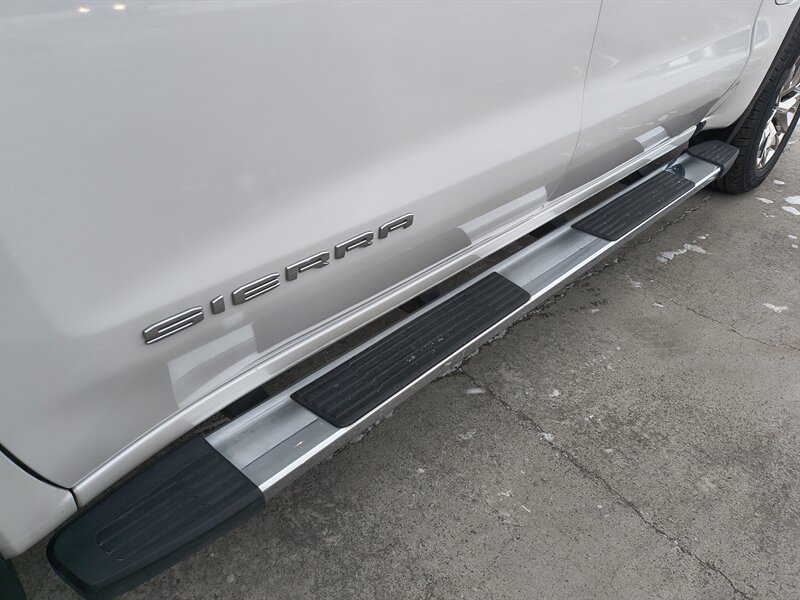 The exterior of the Sierra 1500 SLT features a bold and refined design, complete with a prominent grille and striking LED headlamps that enhance visibility while adding to its rugged aesthetic. The truck is also outfitted with chrome accents, including the front and rear bumpers, which provide a touch of sophistication.