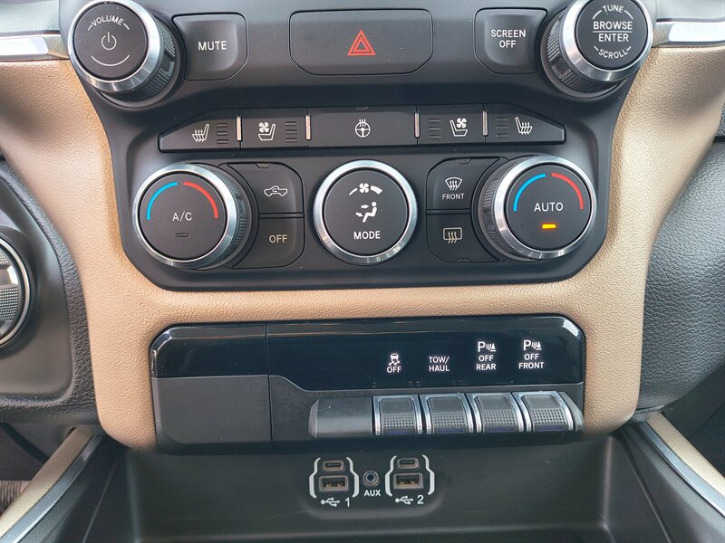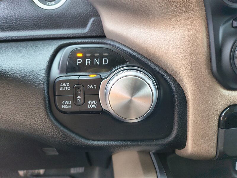 RAM equips the Laramie with the Uconnect infotainment suite (8.4-inch touchscreen on factory Laramie configurations) that supports Apple CarPlay and Android Auto for seamless smartphone integration. The system includes AM/FM and satellite radio capability, Bluetooth hands-free phone and audio streaming, integrated steering-wheel audio and phone controls, and available navigation. Factory USB ports and auxiliary inputs are provided for charging and media connectivity. A backup camera is standard to assist with maneuvering and hitching, and higher-level audio upgrades are available for improved sound quality.